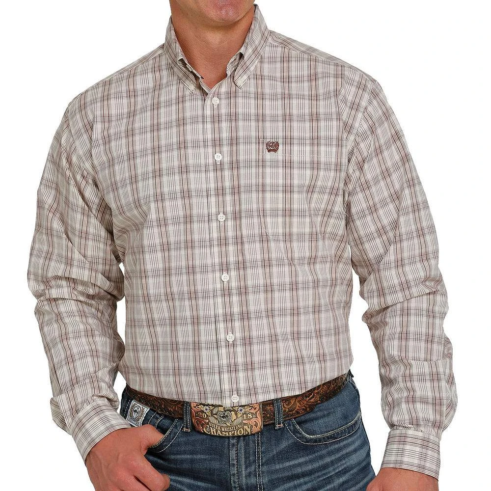When comfort is key, opt for a printed cotton-spandex plain weave like this one engineered by CINCH. Extra stretch provides day-long wearability, with design details including an open left front pocket, embroidered logo and white buttons.