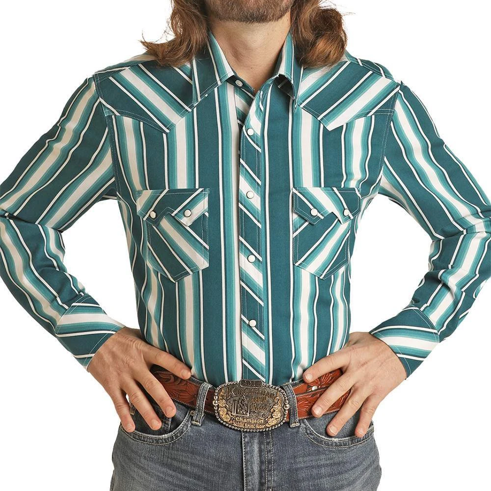 Men’s Rock & Roll Denim Long Sleeve Stripe Print Snap