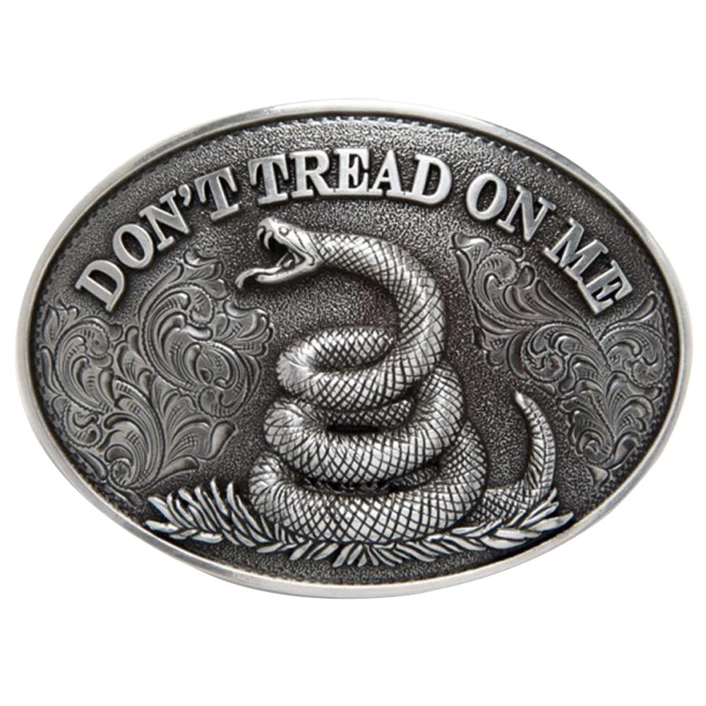 Oval shaped Nocona buckle by M&F Western Products® features a smooth edge with a snake and the words “Don’t Tread On Me” across the top. LASRP finish. Measures 3 ½” x 2 ½”.