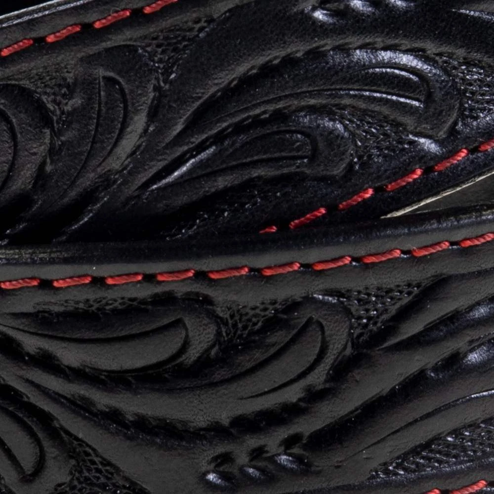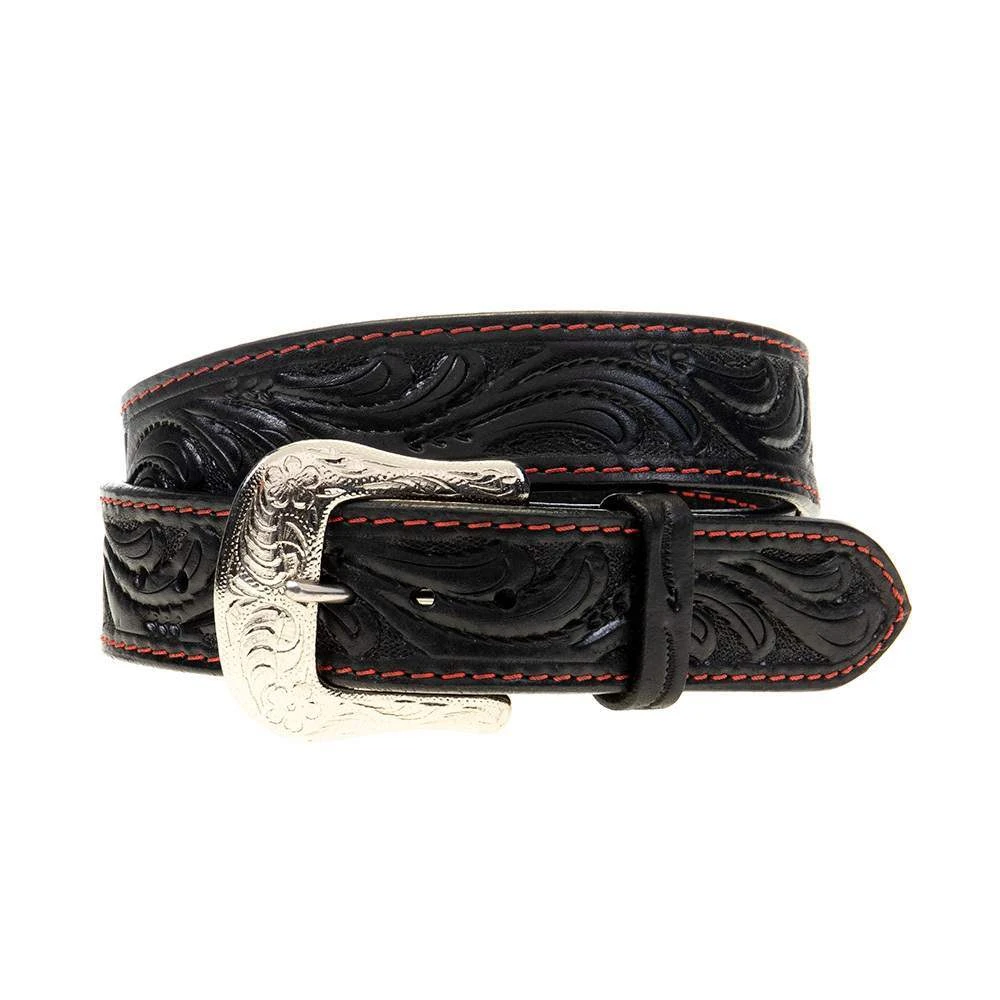 This black tooled belt features a single red stitch, interchangeable silver buckle, and a leather stay.