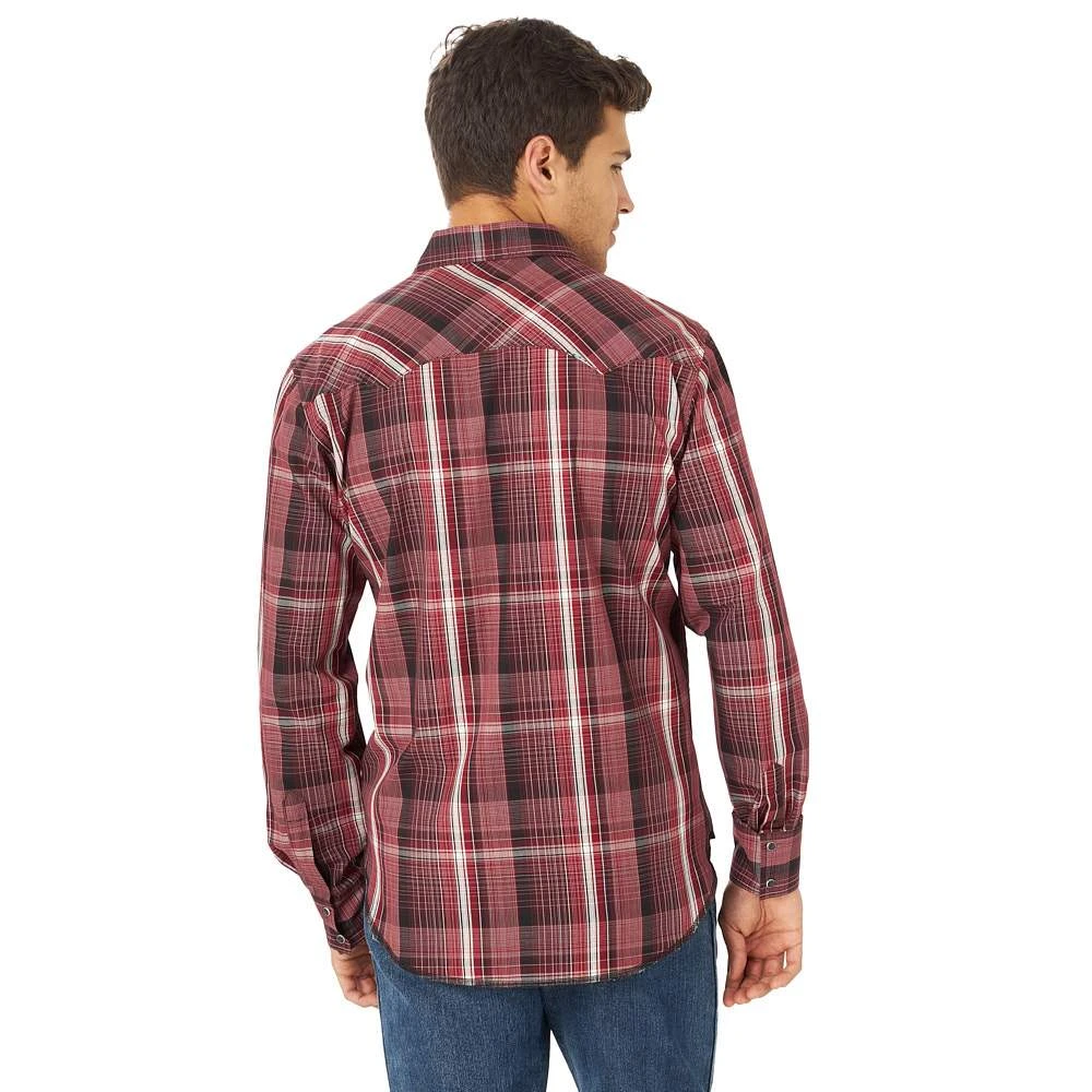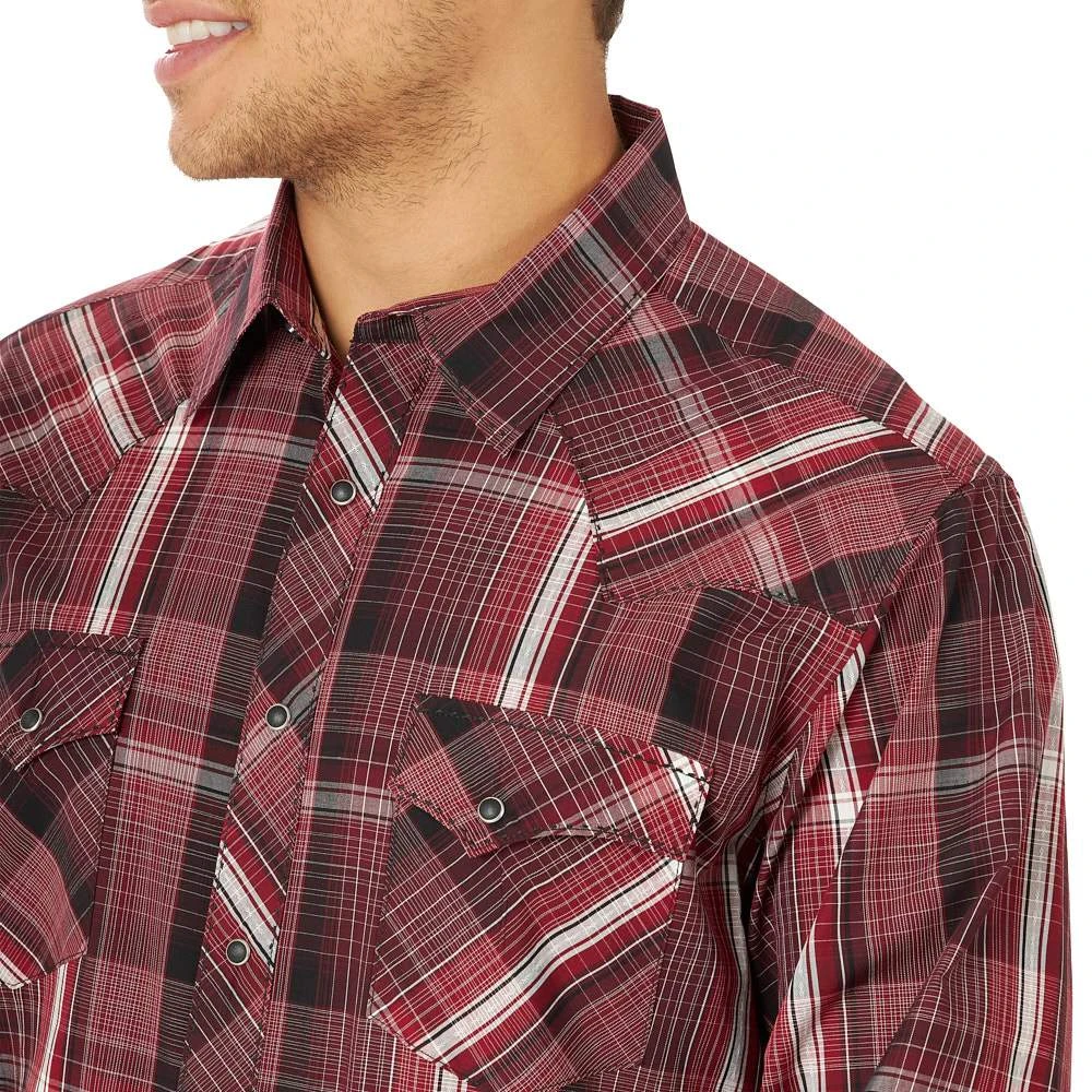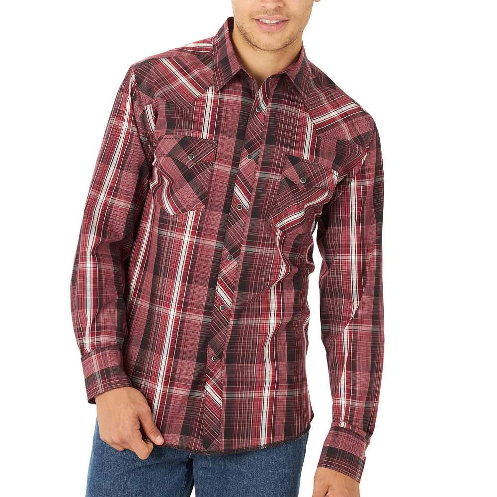 Serving that classic Wrangler® style at its best, this men’s long-sleeve fashion western snap plaid shirt comes with all the distinctive details you know and love. It features rancher’s crease styling in the front, a pointed front yoke, a sawtooth-inspired back yoke, two snap cuffs, double snap flap pockets at the chest, and a curved hem for versatility. It’s made of cotton to keep you comfortable all year long and it features a modern fit. You can leave it untucked or tuck it into your favorite Wrangler jeans, with a t-shirt underneath if you feel like layering.