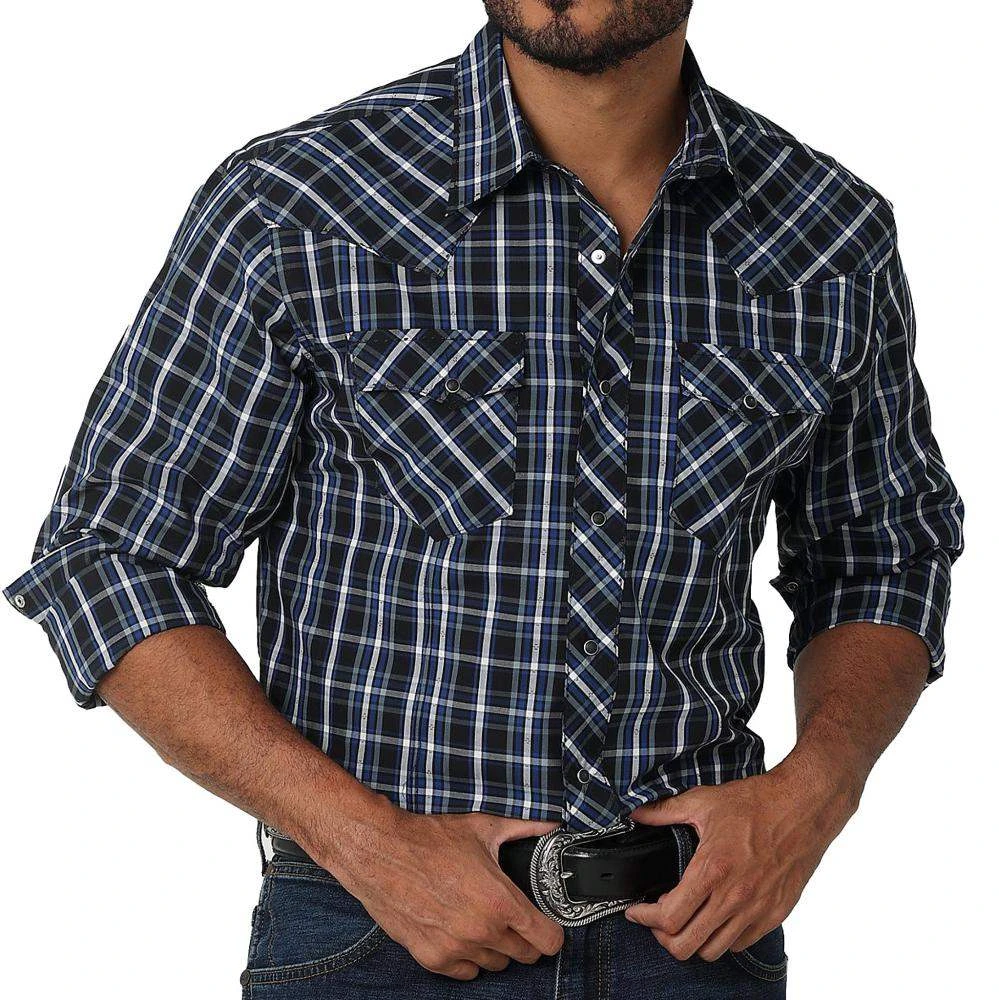 - Mens Easy Care Black Plaid Modern Fit Two Pocket Snap Shirt